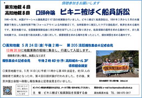 ビキニ被ばく船員訴訟の裁判を始めてから、早や、5年が過ぎました。進行協議が中心で、裁判の動きが見えにくくなっていますが、今回の傍聴、また、当日11時からの帯屋町での街頭署名行動への参加をお願いします。