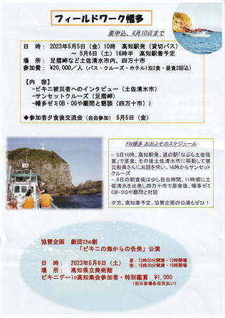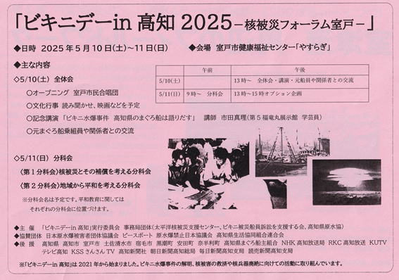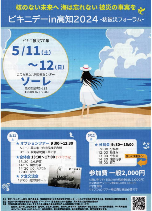 - 12/31 ビキニデーin高知も開催まで5か月となりました。1月19日(日)には、室戸でプレ企画が開催されます。チラシができましたので、メールですが送ります。ご活用ください。両面刷り用になっています。表面はプレ企画、裏面は5/10・11の本企画のお知らせです。参加される場合、メールなどでお知らせいただけますと助かります。