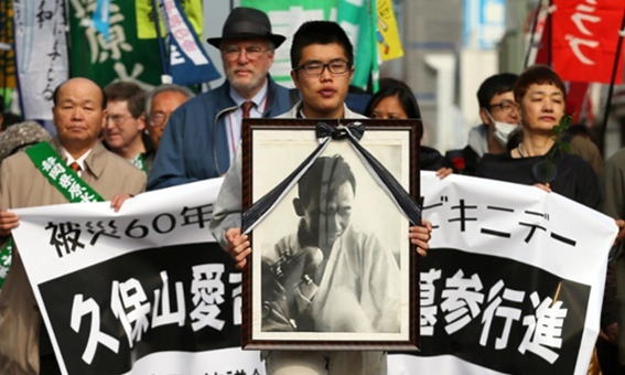 「Setsuko Shimomoto’s father, Tobei Oguro, was a crew member of a tuna fishing boat and exposed to the radiation fallout -or “ashes of death”- of a U.S. hydrogen bomb test over the Bikini Atoll in Marshall Island in 1954. Oguro was diagnosed with stomach cancer and bile duct cancer and died in 2002.