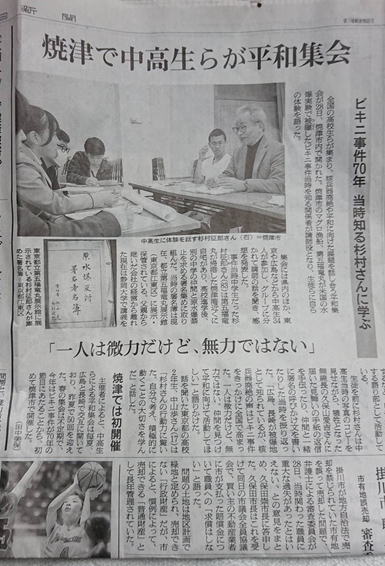 - 3/16 赤旗記事に静岡「エバーグリーン藤枝」の結成20年で第5福竜丸展示館・市田真理さんの講演と高校生たちのトークセッションの様子「ビキニ水爆―私たちが風化させない」が掲載されました。