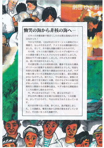 - 2/15 劇団・the創の演劇「ビキニの海からの証」のDVDチラシができました。40年前からビキニ被災船を追跡する高校生ゼミナールの活動を軸に、巨大な事件を地域の被災船員・遺族とともに掘り起こしていく姿が描かれています。ぜひ、平和・人権・地域探求など地域・学校の学習にご利用くだされば幸いです。