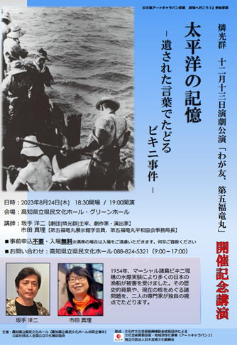 - 12/31 ビキニデーin高知も開催まで5か月となりました。1月19日(日)には、室戸でプレ企画が開催されます。チラシができましたので、メールですが送ります。ご活用ください。両面刷り用になっています。表面はプレ企画、裏面は5/10・11の本企画のお知らせです。参加される場合、メールなどでお知らせいただけますと助かります。
