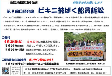 ビキニ被ばく船員訴訟の裁判を始めてから、早や、5年が過ぎました。進行協議が中心で、裁判の動きが見えにくくなっていますが、今回の傍聴、また、当日11時からの帯屋町での街頭署名行動への参加をお願いします。