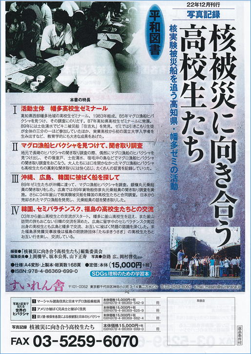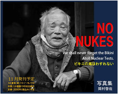 1954年アメリカがマーシャル諸島ビキニ環礁で行った水爆実験での被災船は「第五福竜丸」だけではなかった事実は、1985年に幡多高校生ゼミナールによって明らかになります。しかし政府は「資料は残っていない」「1955年の日米交換文書で決着済み」として隠ぺいしてきました。ところが2013年、アメリカの公文書館でビキニ事件が発見されたことで、日本政府は2014年ついに核被災事実を認めざるを得なくなり、資料を公開しました。日本政府の60年間もの核被災の隠ぺいによって、多くの若き船員たちがガンなどの病で命を奪われました。また、ご存命の方も高齢で、ガンや様々な病気を抱え闘病生活を送っています。写真集『NO NUKES(核はいらない)』は、先立って逝った仲間の無念を背負って生きる元船員と、遺族たちの写真集で、「第五福竜丸」元船員も含む40数名(マグロ船20隻)が紹介されます。