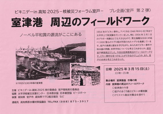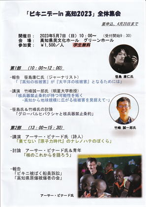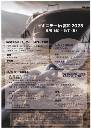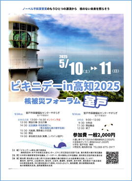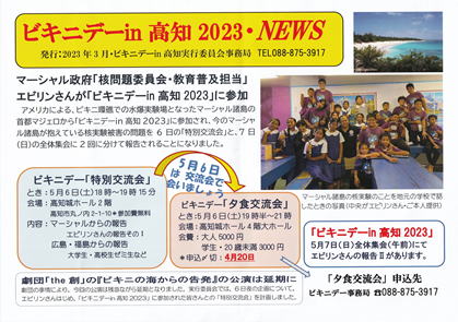 - 12/31 ビキニデーin高知も開催まで5か月となりました。1月19日(日)には、室戸でプレ企画が開催されます。チラシができましたので、メールですが送ります。ご活用ください。両面刷り用になっています。表面はプレ企画、裏面は5/10・11の本企画のお知らせです。参加される場合、メールなどでお知らせいただけますと助かります。