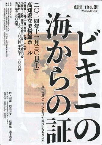 - 2/15 劇団・the創の演劇「ビキニの海からの証」のDVDチラシができました。40年前からビキニ被災船を追跡する高校生ゼミナールの活動を軸に、巨大な事件を地域の被災船員・遺族とともに掘り起こしていく姿が描かれています。ぜひ、平和・人権・地域探求など地域・学校の学習にご利用くだされば幸いです。
