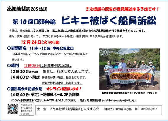 12月24日高知地裁で、第10回口頭弁論が行われます。2次提訴の久保尚さん(第二幸成丸元船員)の証人尋問を行う予定です。周りに拡散してください。また、当日、午前11時から、帯屋町中央公園北口で、高知地裁に「公正な判決を求める署名」行動を予定しています。併せてご協力をお願いします。