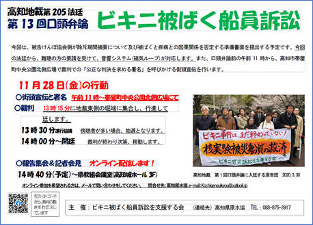 ビキニ被ばく船員訴訟の裁判を始めてから、早や、5年が過ぎました。進行協議が中心で、裁判の動きが見えにくくなっていますが、今回の傍聴、また、当日11時からの帯屋町での街頭署名行動への参加をお願いします。