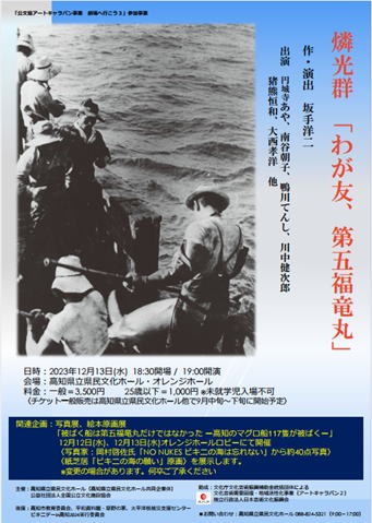 - 12/28 演劇「ビキニの海からの証」の感想が届きました。昼の部はほぼ満席、夜の部は中高大学生が多く、その感想の一部と出演された宮川さんの感想を紹介します。プロの制作で年内にDVD作成され、試写会を済ませてダイジェスト版を作成し普及する予定です。 感想1 感想2 感想3 感想4