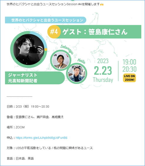 世界のヒバクシャと出会うユースセッション というイベントを企画している若者が広島・長崎にいて、23日の夜にオンラインイベントを開いてくれます。マグロ漁船員たちの被ばくについて話します。核問題に関心のある若い世代の横のつながりをつくろうという取り組みで、参加対象者は35歳以下です。高知の若い世代にも届けられるといいなと思うのですが、どなたか関心ありそうな方はいないでしょうか? 情報をつないでもらえるもうれしいです。よろしくお願いいたします。笹島康仁