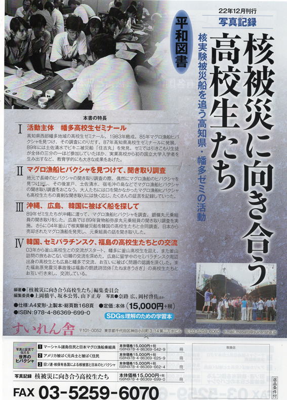 - 3/14 第5福竜丸平和協会発行の「福竜丸だより」に広島高校生平和ゼミナール世話人の澤野重男さんによる「核被災に向き合う高校生」の書評が掲載されました。澤野重男さんは、幡多高校生ゼミナールの活動初期から福島集会、「核兵器禁止条約教材」作成まで、支援をしていただき、「核兵器禁止条約に希望をつなぐ人たちに、この本を見てほしい」とエールを送っていただきました。