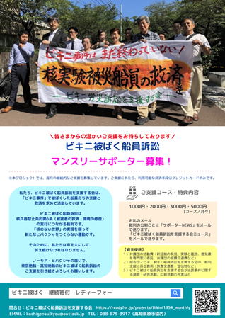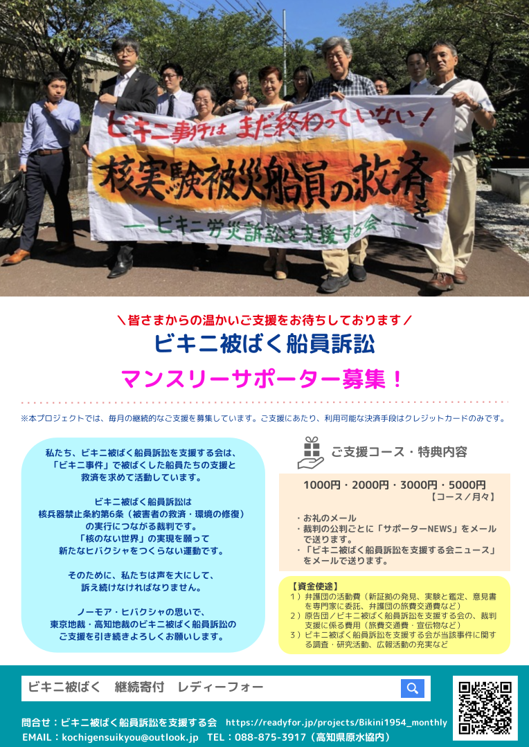 ビキニ被ばく船員訴訟の裁判を始めてから、早や、5年が過ぎました。進行協議が中心で、裁判の動きが見えにくくなっていますが、今回の傍聴、また、当日11時からの帯屋町での街頭署名行動への参加をお願いします。