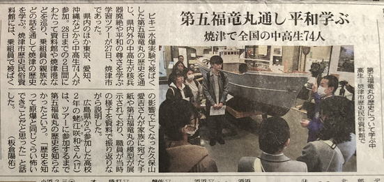 - 3/16 赤旗記事に静岡「エバーグリーン藤枝」の結成20年で第5福竜丸展示館・市田真理さんの講演と高校生たちのトークセッションの様子「ビキニ水爆―私たちが風化させない」が掲載されました。
