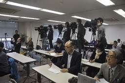 会見する訴訟代表と7名の弁護団 報道カメラ5台